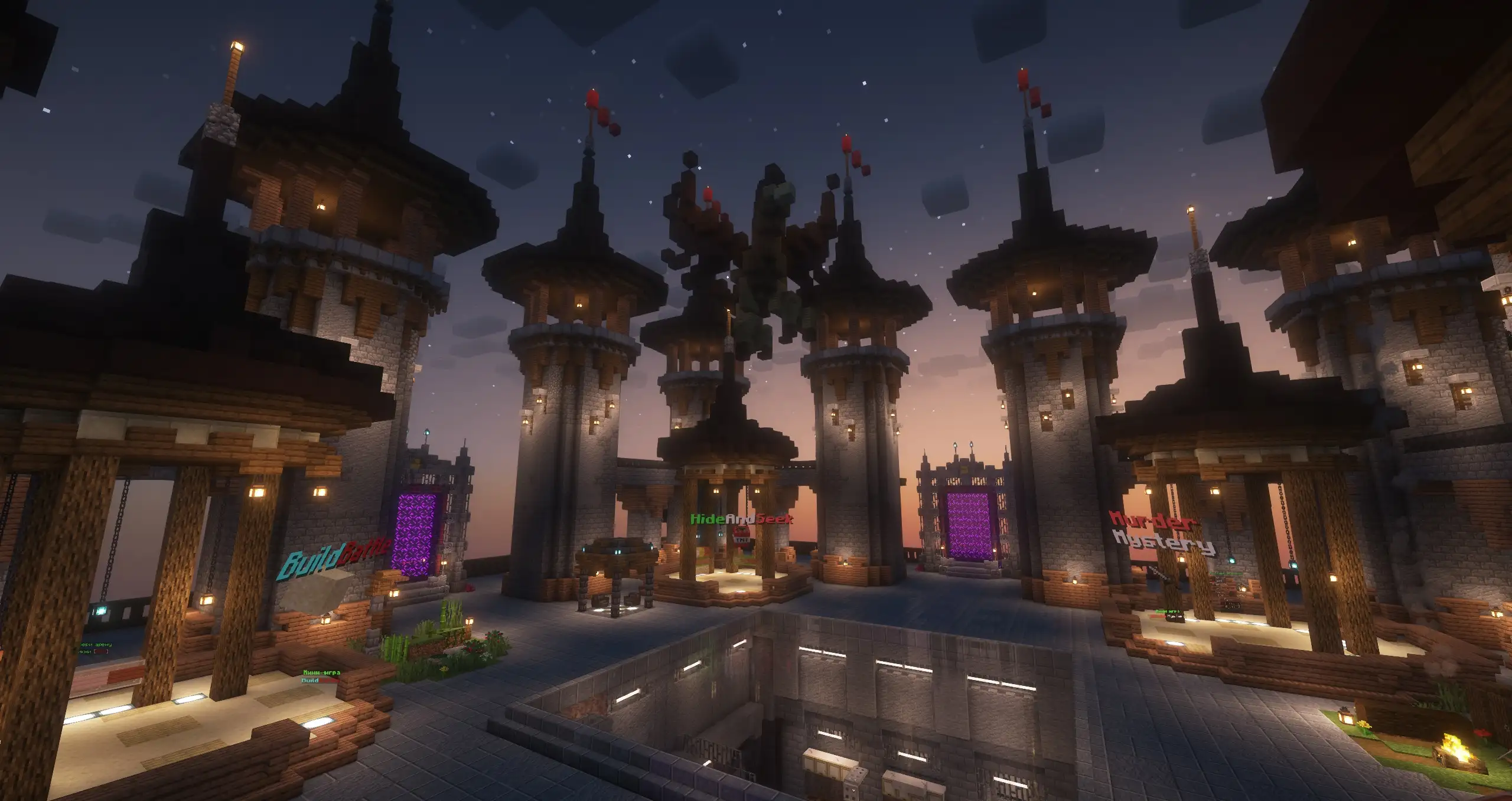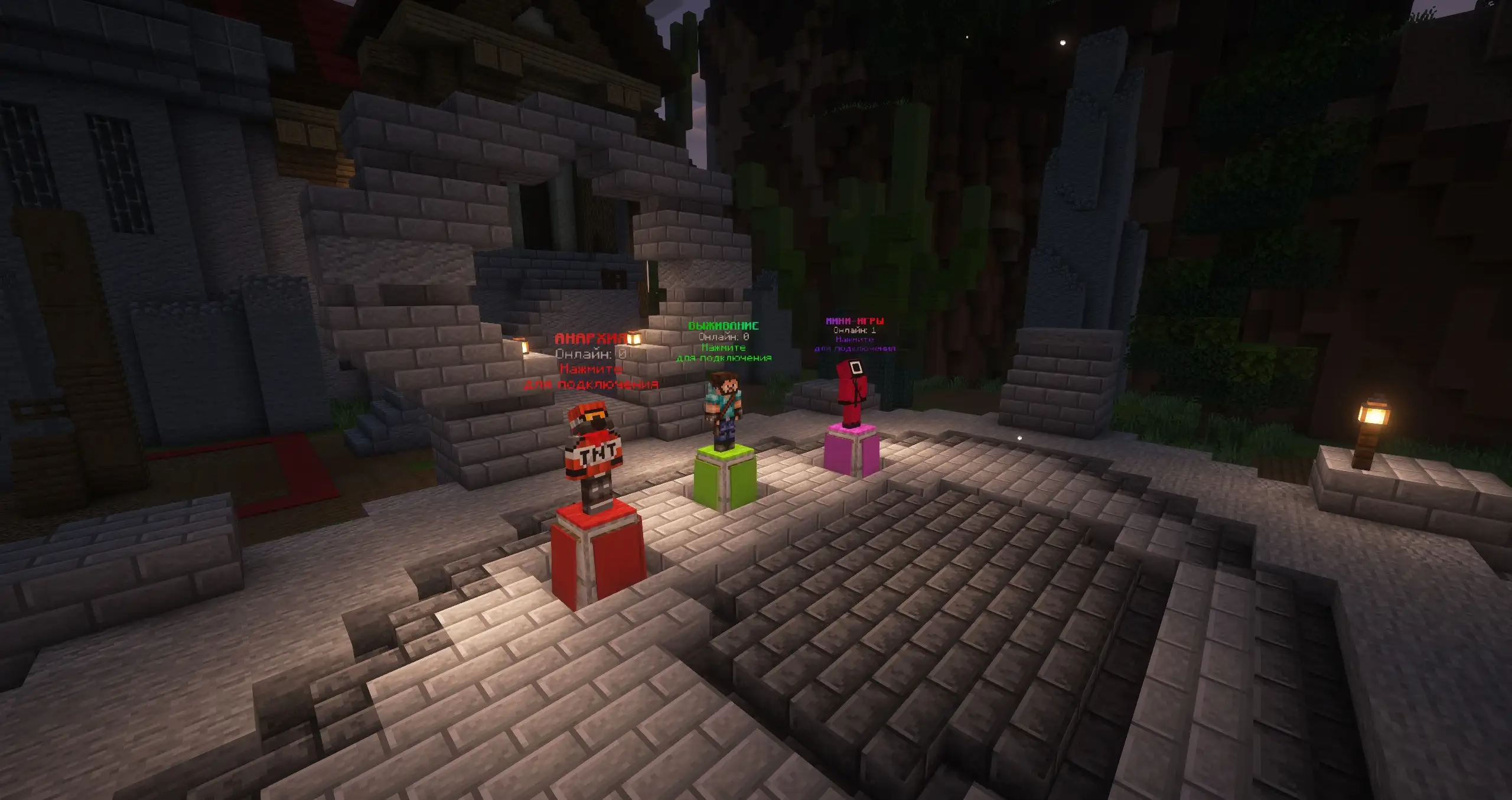 - Классическое выживание, одинблок , мини-игры (прятки, тайна убийцы, битва строителей, бридж)