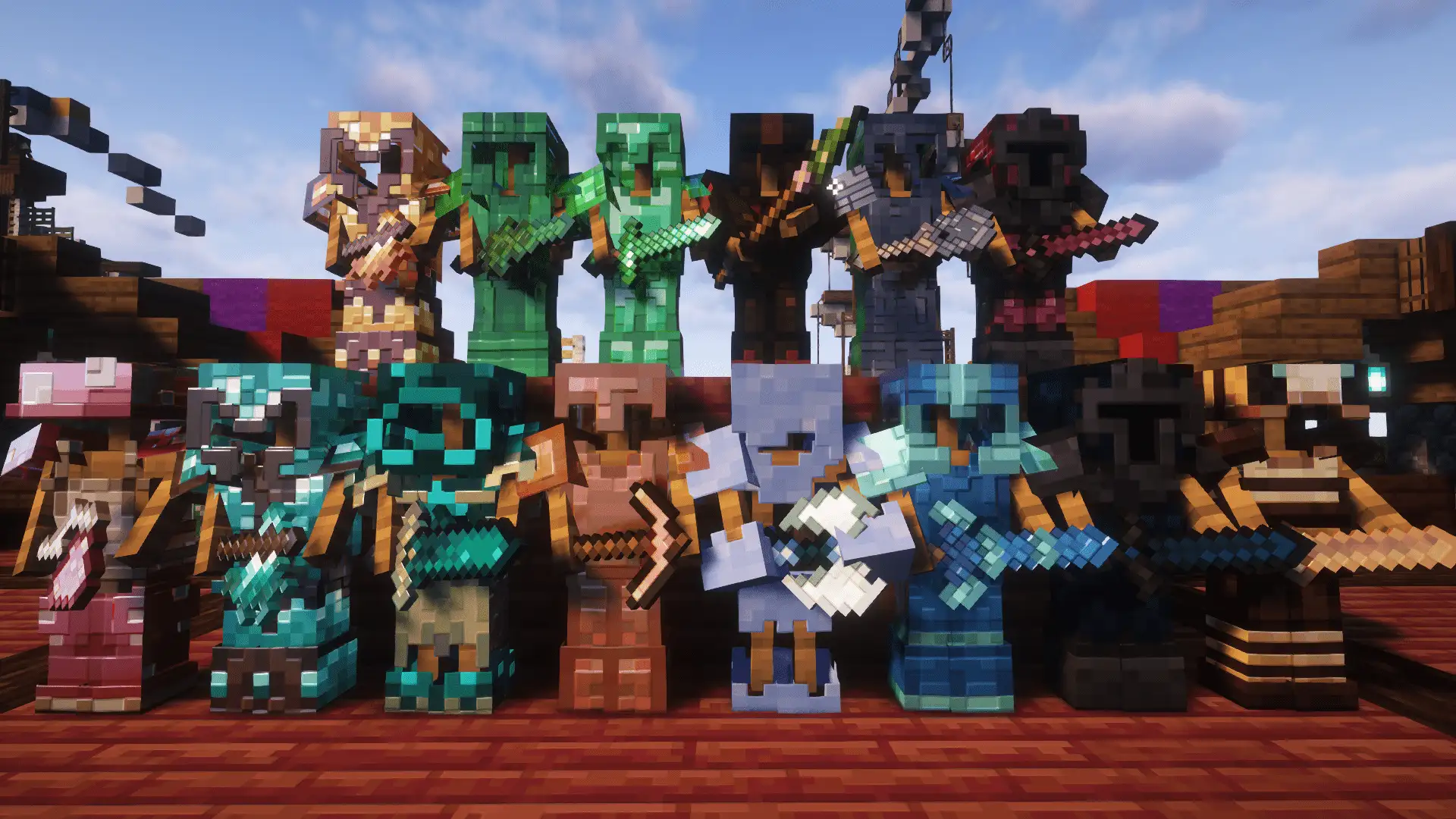 Богатый выбор оружия и брони, которые можно скрафтить, купить у торговцев или выбить с монстров, найти в данжах в обычном мире и Аду. Они дадут вам преимущество в битве с боссами и игроками
