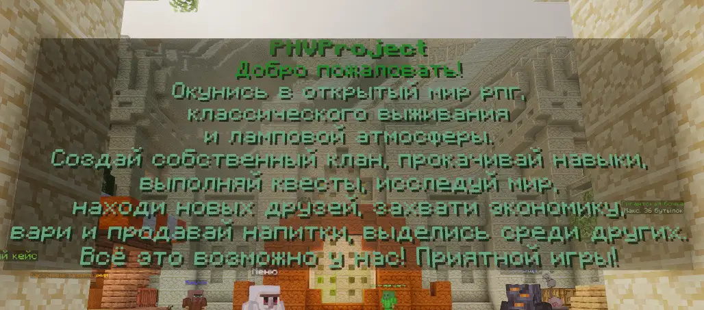 Отличный майнкрафт сервер с элементами RPG, выживания, квестами, дуэлями, кланами, собственными предметами, казино, варка напитков. На сервере ламповое и дружелюбное комьюнити. Кастомная генерация мира Terralith. Серьёзная и ответственная администрация и частые ивенты, с которыми вы не сможете заскучать. Играйте в одиночку, приглашайте и находите друзей и у нас, постройте собственную империю либо захватите экономику, безграничный мир возможностей только у нас.