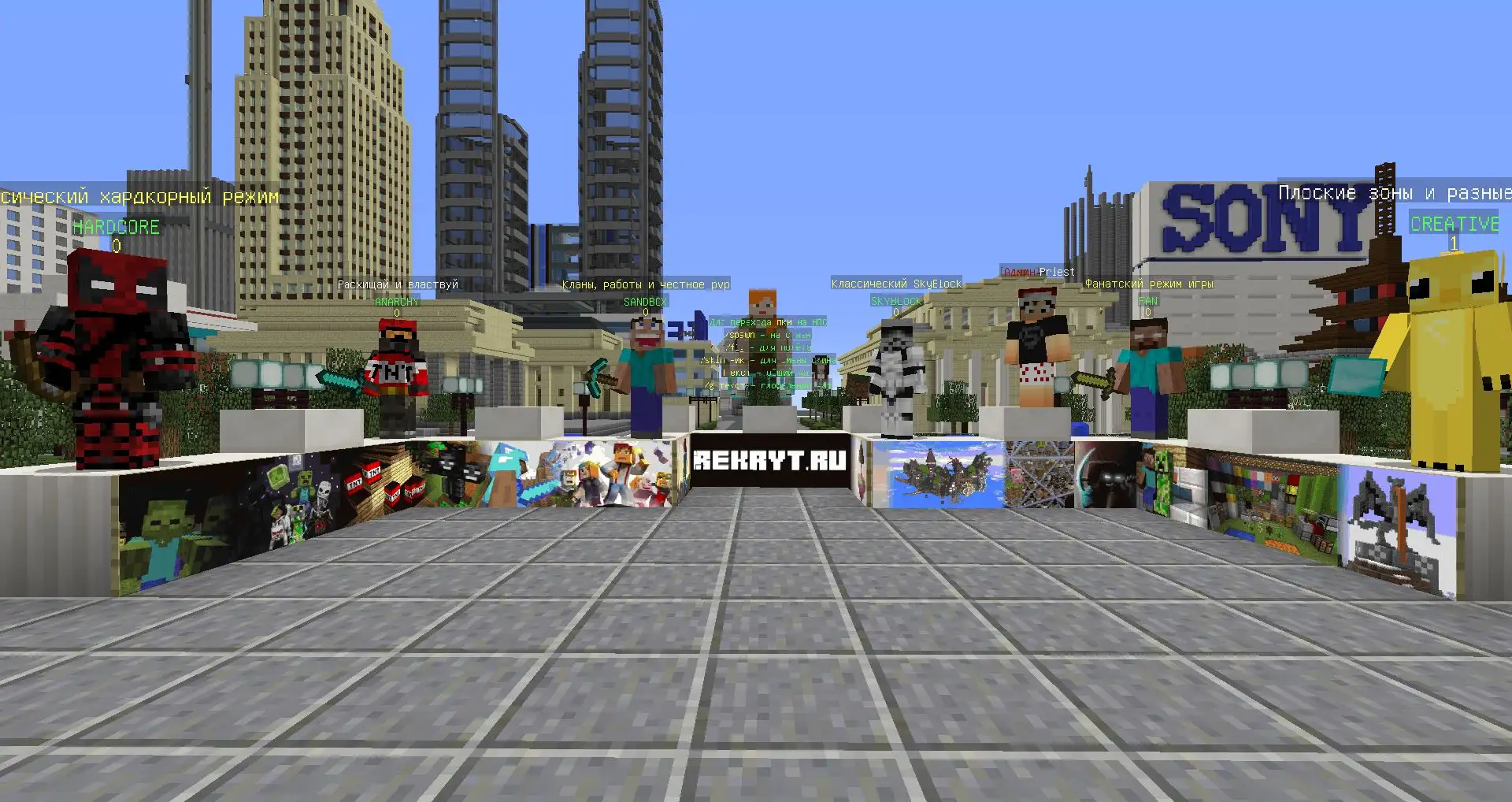 - SkyBlock - Сразу несколько видов необычного выживания на летающих островах: таких как классический skyblock, безумный skygrid и мини-игры bedwars.